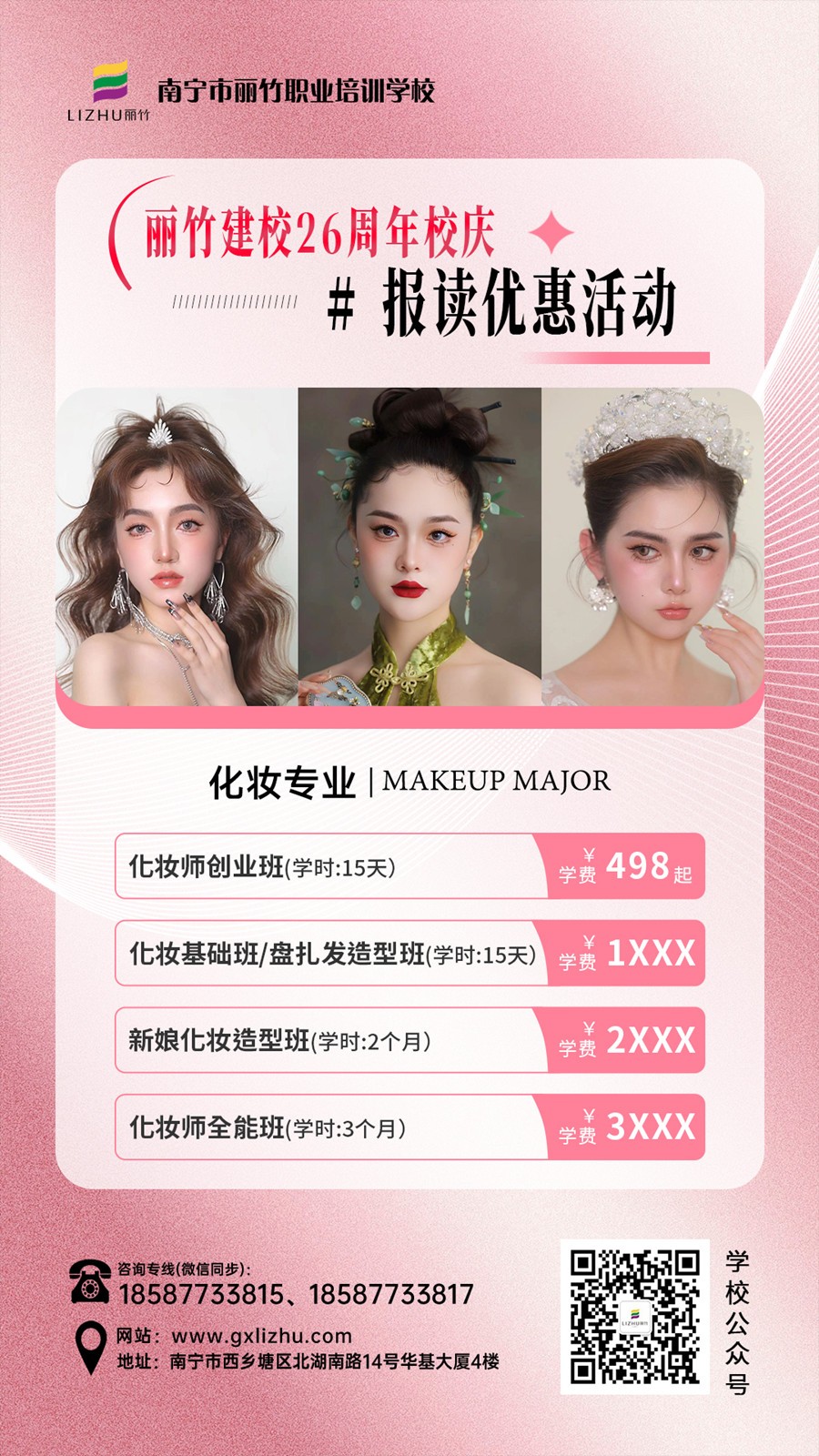 如果你想知道廣西學(xué)彩妝哪里學(xué)費便宜?那及千萬不要錯過廣西彩妝學(xué)校排行前十的麗竹學(xué)校正在進行的建校26周年報讀優(yōu)惠活動啦!因為,只要現(xiàn)在報名,學(xué)習(xí)化妝全部都是親民價!