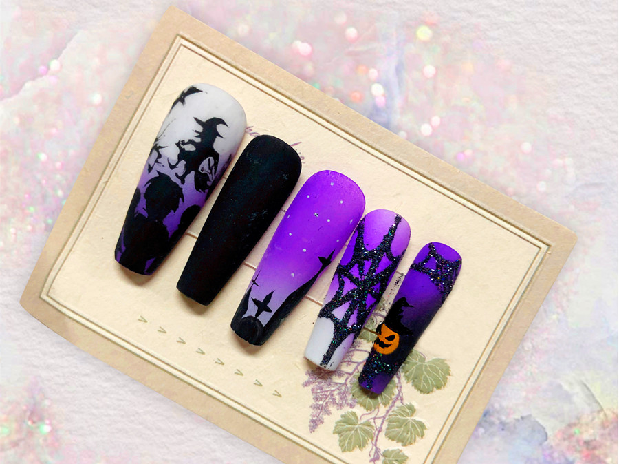 美甲繪制靈感來(lái)源:神秘深邃的夜色里,黑色剪影下的女巫騎著掃把,在烏鴉的陪伴下,從男孩眼前飛過(guò)。在靜謐的得白色月光照耀下,閃現(xiàn)出一幅既充滿(mǎn)童趣,又略帶詭異氛圍的剪影畫(huà)面。
